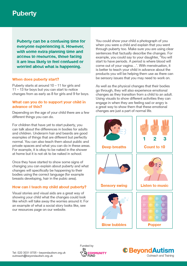 You could show your child a photograph of you when you were a child and explain that you went through puberty too. Make sure you are using clear sentences that factually describe the changes. For example, you could say to your daughter, ‘You will start to have periods. A period is where blood will come out of your vagina…’. With menstruation, it is better to teach your child in advance about the products you will be helping them use as there can be sensory issues that you may need to work on.